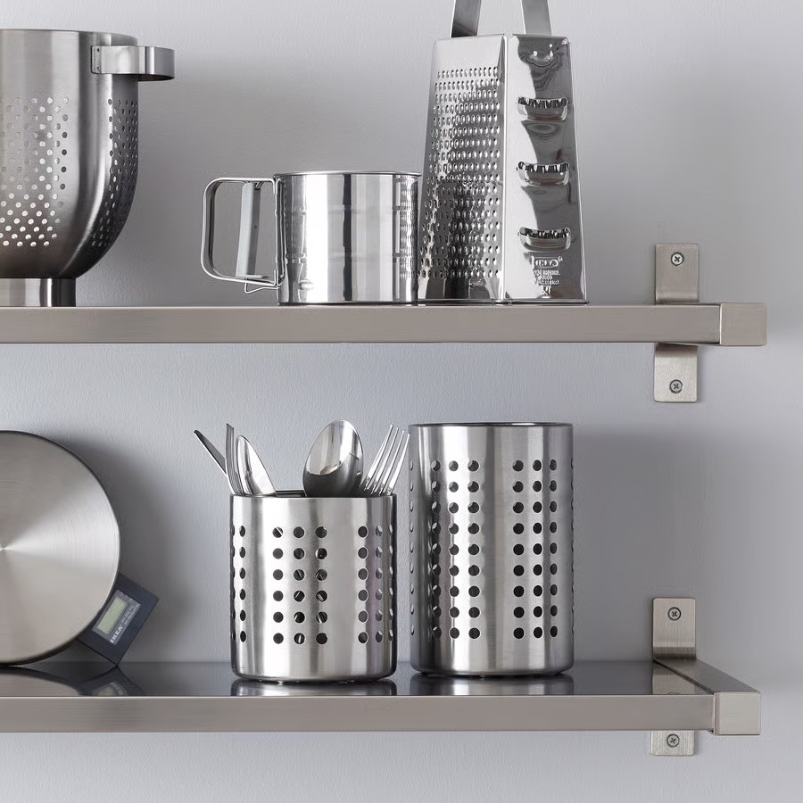 Este escurrecubiertos de acero inoxidable es perfecto tanto para escurrir cubiertos junto al fregadero como para colocar los cubiertos secos en un estante.